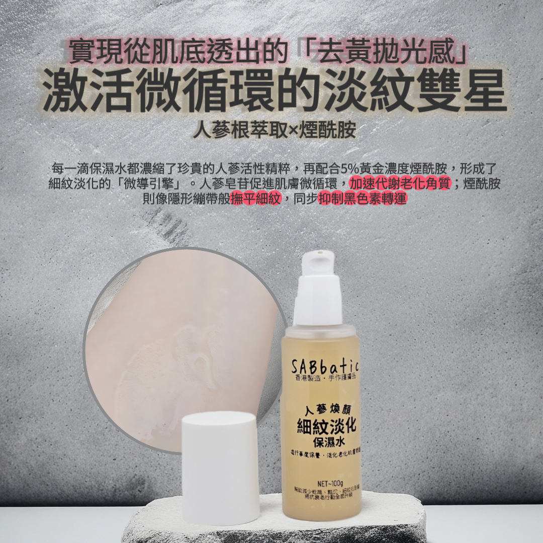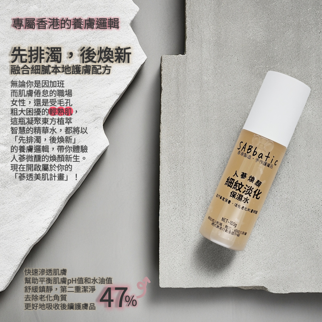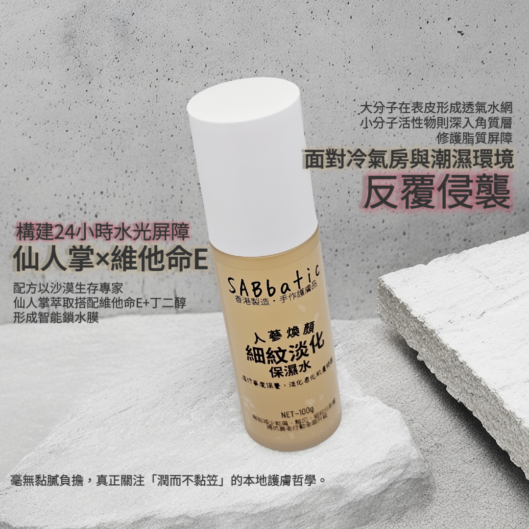 觸感透薄,清新香味,適合香港潮濕氣候使用。配合煙酰胺及仙人掌萃取於配方內,加强細紋淡化功效之餘,更幫助收細毛孔、改善膚色不均暗沉等問題。成分提升微循環,增強皮膚營養及彈性,使細胞得到新生,提升肌膚的更生機能,進行蔘度保養,淡化老化肌膚問題,幫助減少乾扁、黯沉、細紋的影響,將抗衰老行動全面升級。