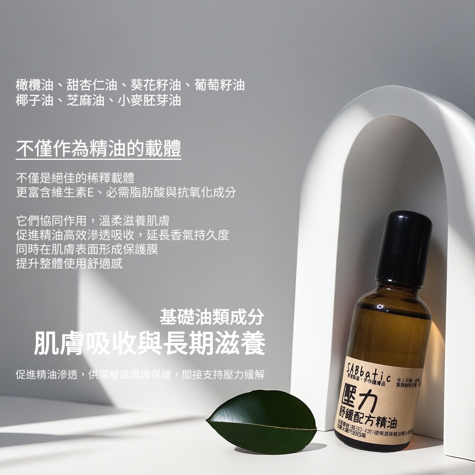 多元頂級基礎油:橄欖油、甜杏仁油、葵花籽油、葡萄籽油、椰子油、芝麻油、小麥胚芽油的黃金組合,不僅是絕佳的稀釋載體,更富含維生素E、必需脂肪酸與抗氧化成分。它們協同作用,溫柔滋養肌膚,促進精油高效滲透吸收,延長香氣持久度,同時在肌膚表面形成保護膜,提升整體使用舒適感。