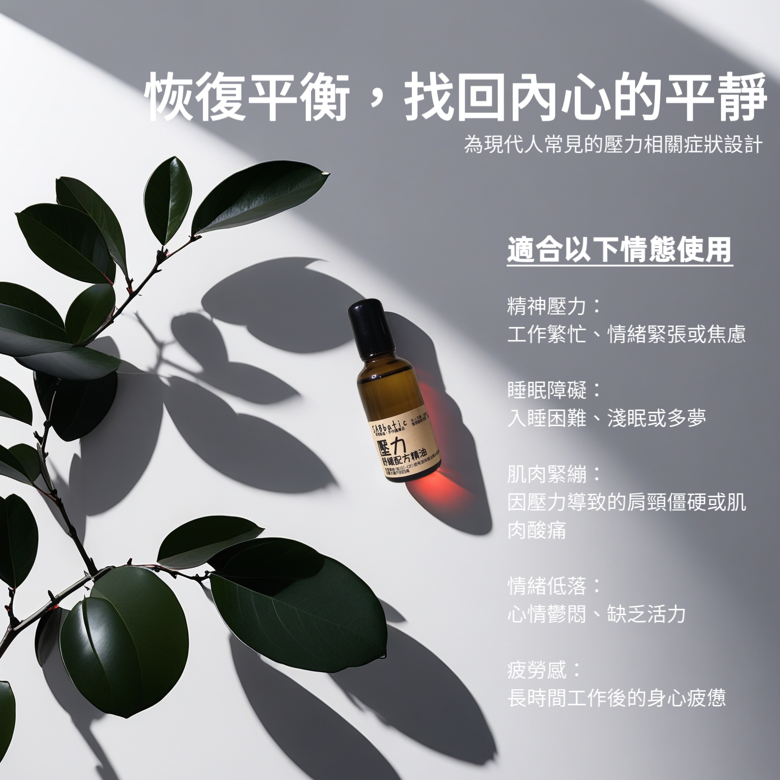 適用症狀:無論是日常壓力還是偶爾的低潮,這款精油都能幫助您恢復平衡,找回內心的平靜。這款精油專為現代人常見的壓力相關症狀設計,適用於: