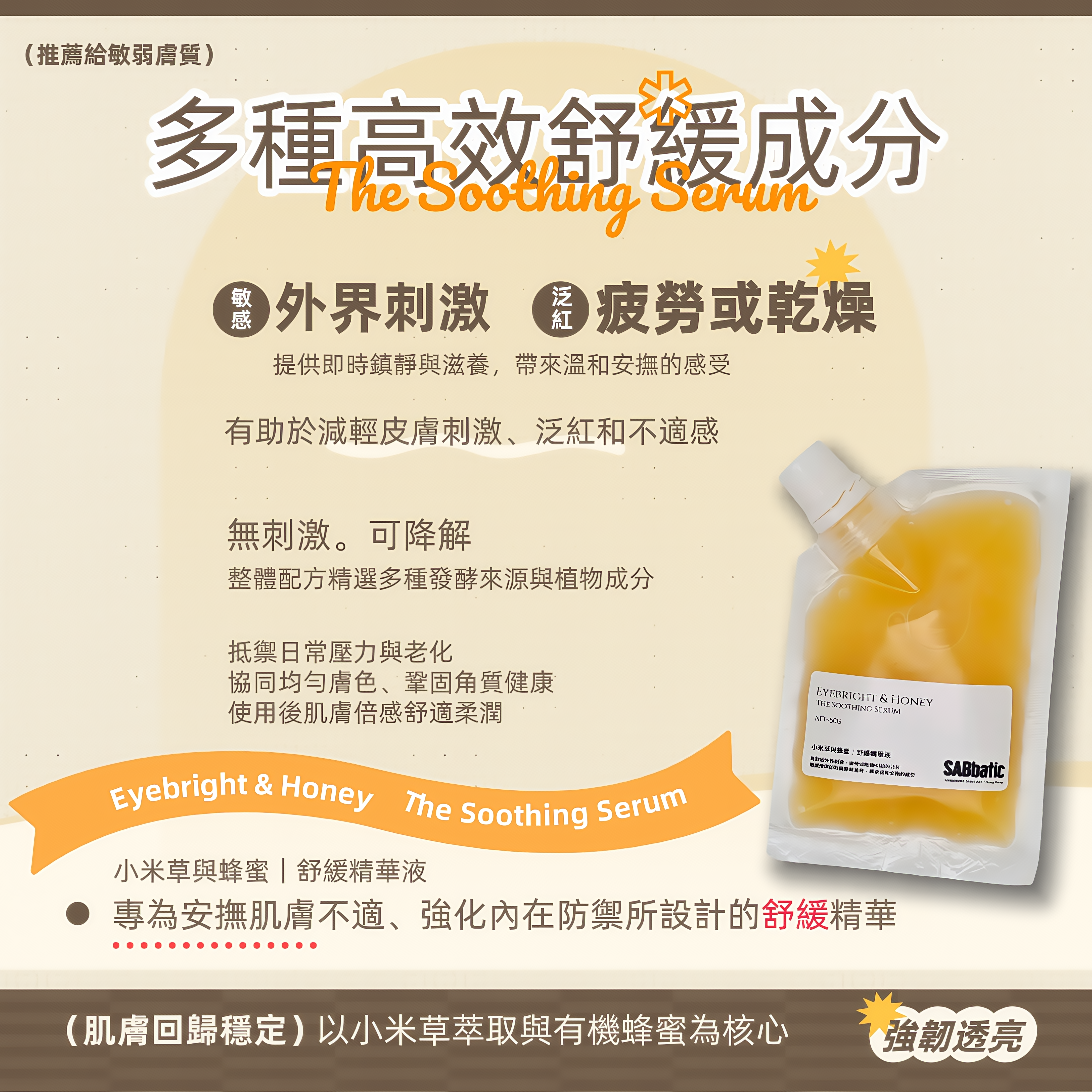「小米草與蜂蜜|舒緩精華液」是一款專為安撫肌膚不適、強化內在防禦所設計的舒緩精華。產品以小米草萃取與有機蜂蜜為核心,針對因外界刺激、疲勞或乾燥引起的泛紅、敏感提供即時鎮靜與滋養,帶來溫和安撫的感受。