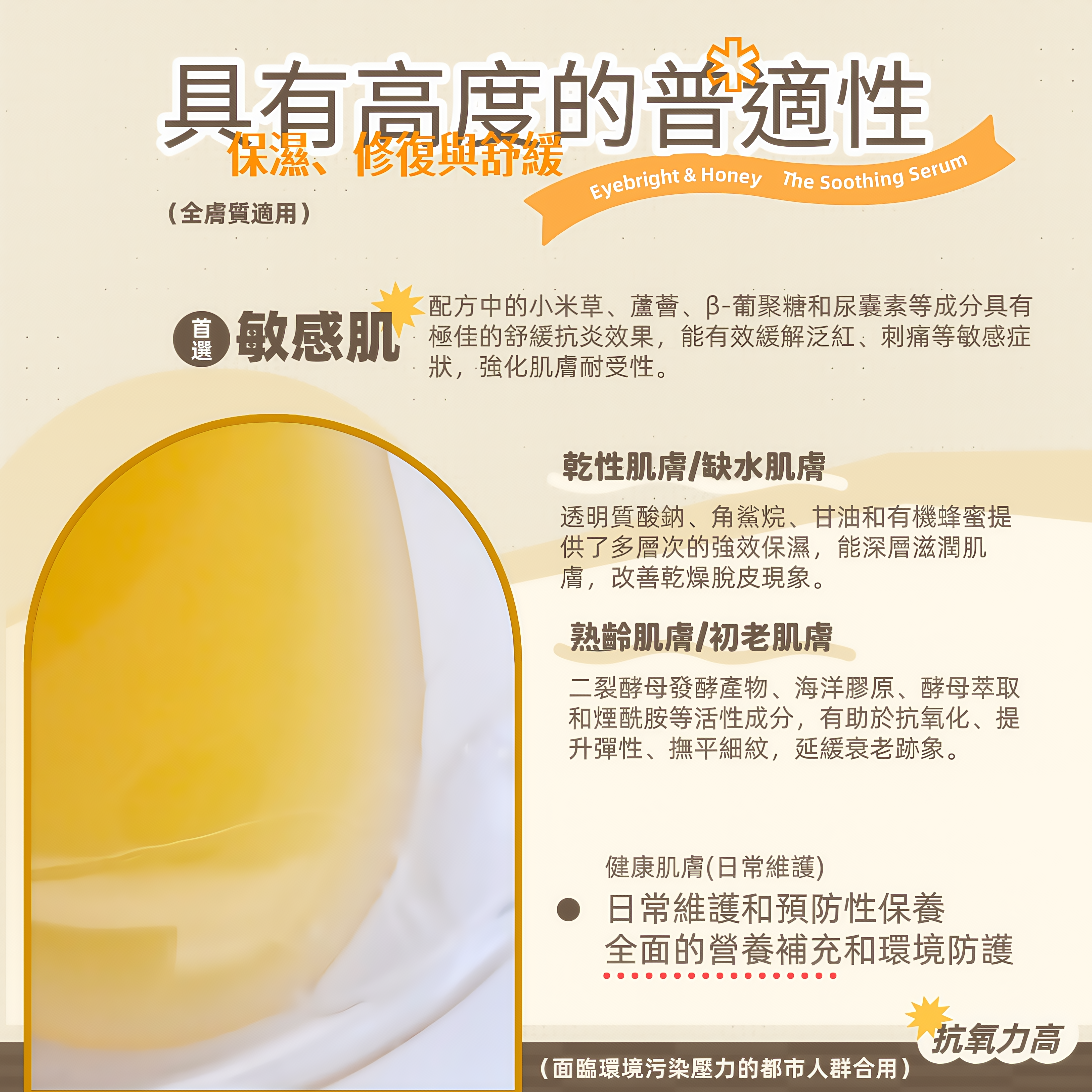 這款精華液結合了多種高效保濕、修復與舒緩成分,使其具有高度的普適性。特別適合以下膚質與人群: