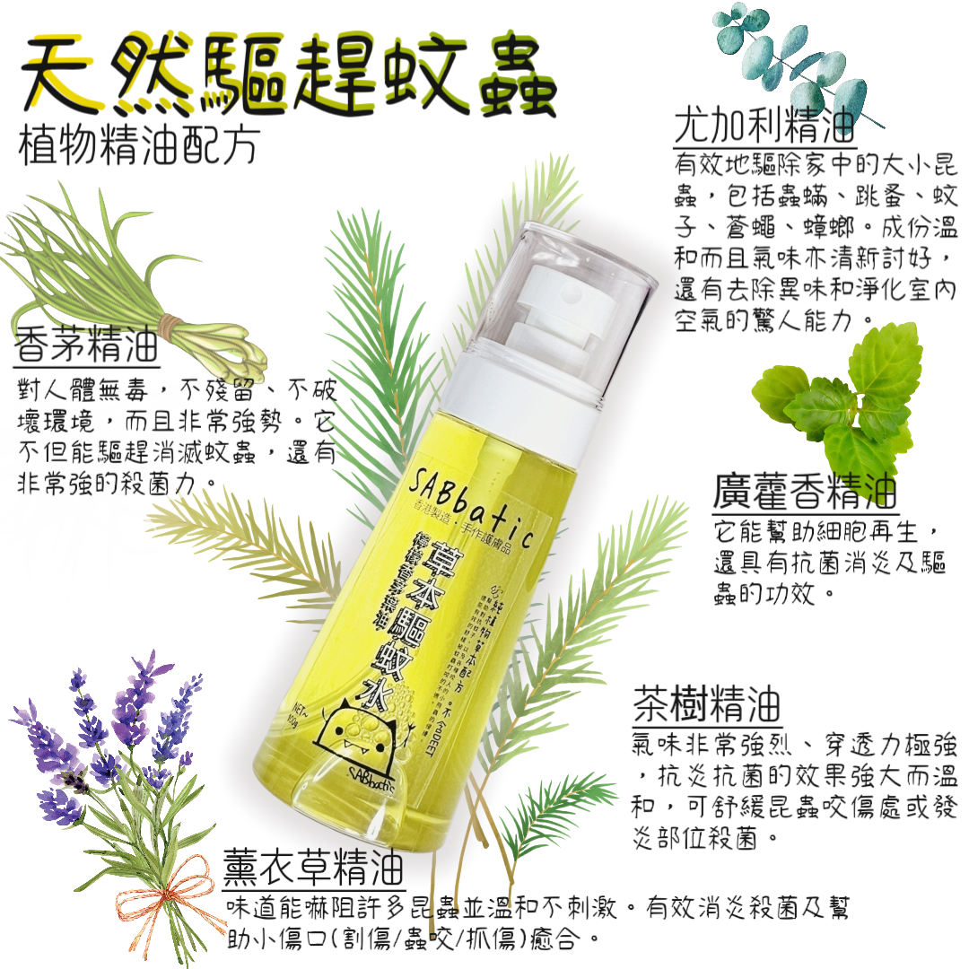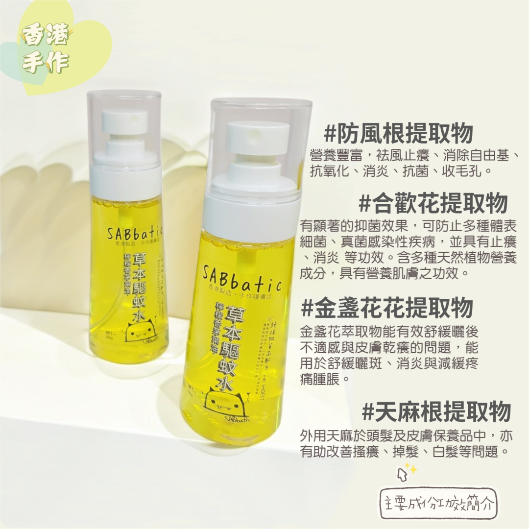 草本驅蚊水含多種植物萃取及精油,驅趕蚊蟲同時保養及皮膚。緩解敏感症狀,安撫止癢、祛紅消腫、長效固屏等功效。純植物草本配方,不含DEET(驅蚊胺),對皮膚和環境都是安全無害的,它可以幫助對抗蚊子,以及各種咬人的小飛蟲的侵擾,還能有效的舒緩被蚊蟲叮咬的不適。