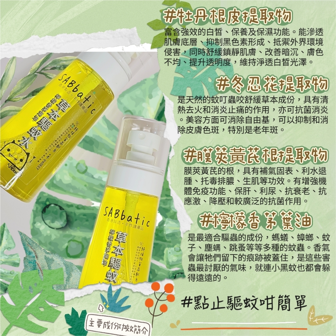 檸檬香茅葉油、冬忍花提取物、牡丹根皮提取物、膜莢黃芪根提取物、防風根提取物、金盞花花提取物、合歡花提取物、天麻根提取物 、冰片、薄荷醇、L-乳酸薄荷酯、燕麥活性成分(羥苯基丙酰胺苯甲酸)、避蚊酯、有機香水酒精、丁二醇、PEG-40氫化蓖麻油、1,2-戊二醇、,2己二醇、馨鮮酮、純水
