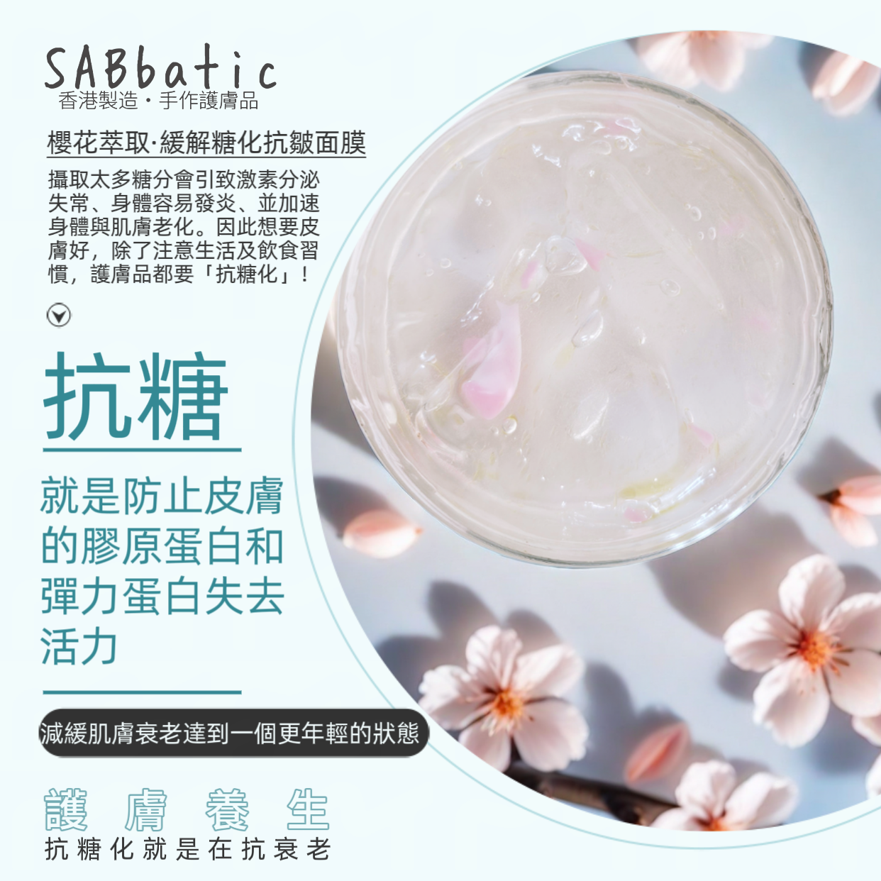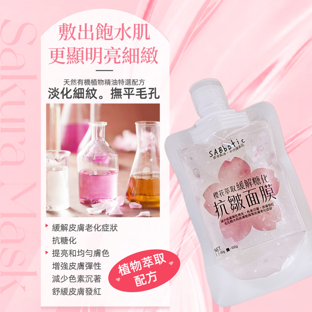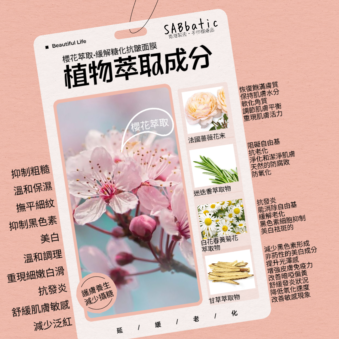 櫻花萃取·緩解糖化抗皺面膜是一款含有櫻花及其他9種植物萃取物的面膜,主要功效是抗糖化、提亮和均勻膚色。櫻花萃取物可以抑制糖化終產物 (AGEs) 的產生,減少對膠原蛋白的破壞,促進膠原蛋白增生,達到抗衰老的效果。此外,櫻花萃取物還可以減少皮膚彈性喪失、色素沉著、皮膚發紅、毛孔粗大和皮膚乾燥等皮膚老化症狀。適合任何肌膚類型,尤其是敏感肌膚。