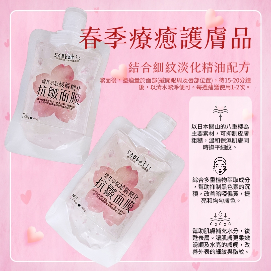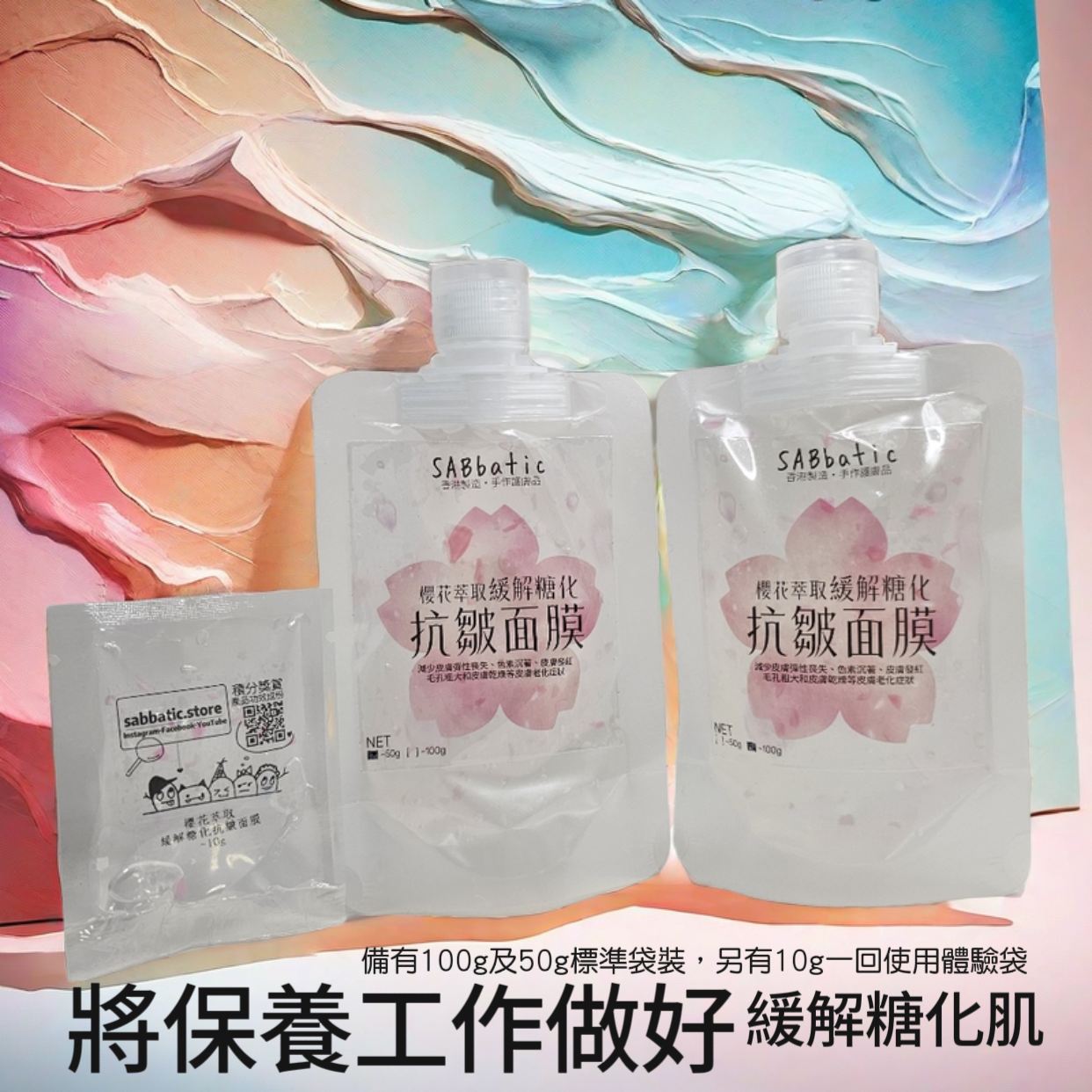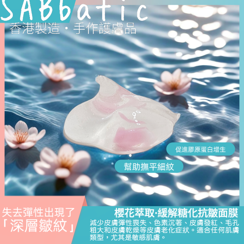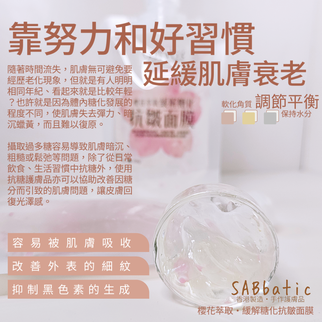 櫻花萃取·緩解糖化抗皺面膜是一款含有櫻花及其他9種植物萃取物的面膜,主要功效是抗糖化、提亮和均勻膚色。櫻花萃取物可以抑制糖化終產物 (AGEs) 的產生,減少對膠原蛋白的破壞,促進膠原蛋白增生,達到抗衰老的效果。此外,櫻花萃取物還可以減少皮膚彈性喪失、色素沉著、皮膚發紅、毛孔粗大和皮膚乾燥等皮膚老化症狀。適合任何肌膚類型,尤其是敏感肌膚。