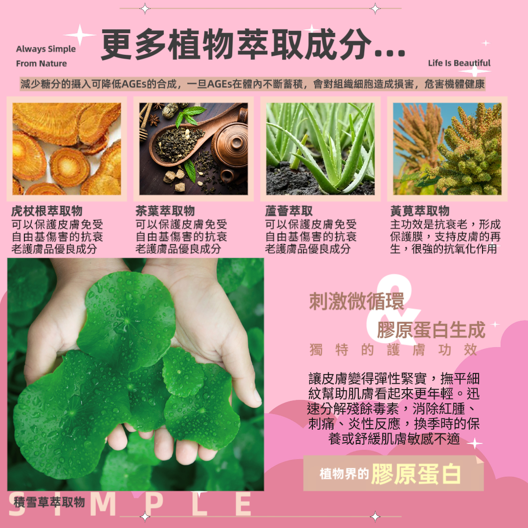 8.積雪草萃取物:積雪草被讚譽為是『植物界的膠原蛋白』,獨特的護膚功效不僅能刺激微循環,還能讓膠原蛋白生成增加,促進表皮角質化並有助於產生新的結締組織,讓皮膚變得彈性緊實。積雪草成分可以加速皮膚細胞再生,撫平細紋幫助肌膚看起來更年輕。積雪草萃取有助去皺緊膚–刺激細胞更新、強化血管、毛細管和增加緊實度等作用;另有促進肌膚分解酶的產生,迅速分解殘餘毒素,幫助血液順暢流動,加速減退暗瘡印;亦可清熱毒,有效消除肌膚紅腫、 刺痛、炎性反應。積雪草萃取本⾝具有完整的保濕滋潤、舒緩鎮靜功效,換季時的保養或應急舒緩肌膚不適問題,都可以使⽤它來改善及調理。溫和不刺激,就算是敏感肌膚或任何膚況也適用。