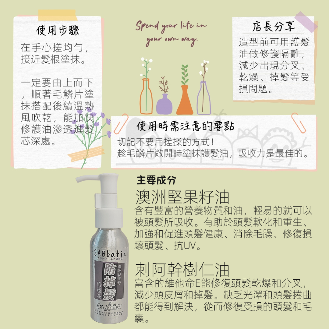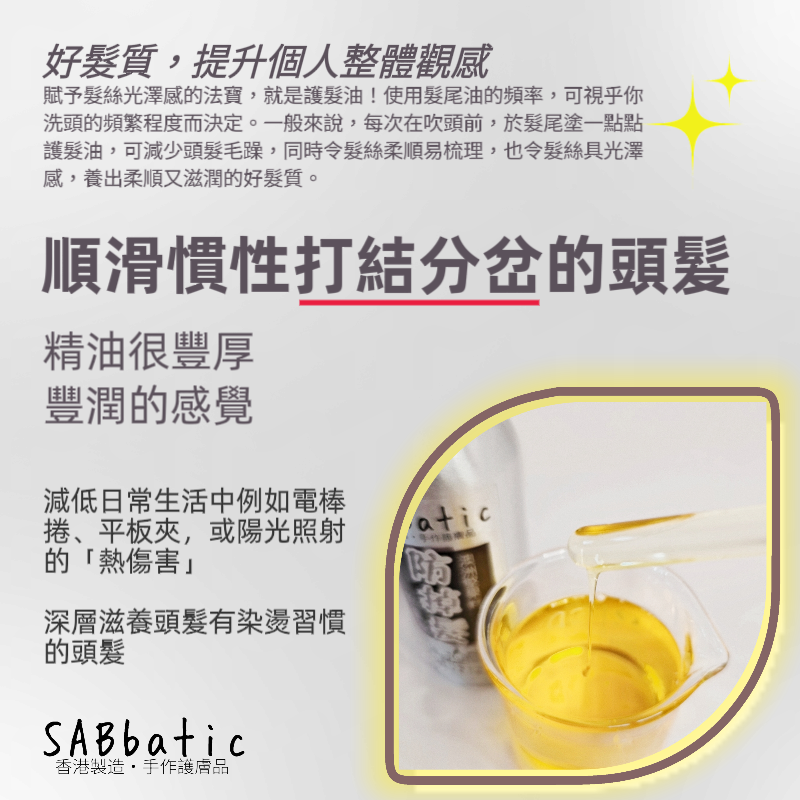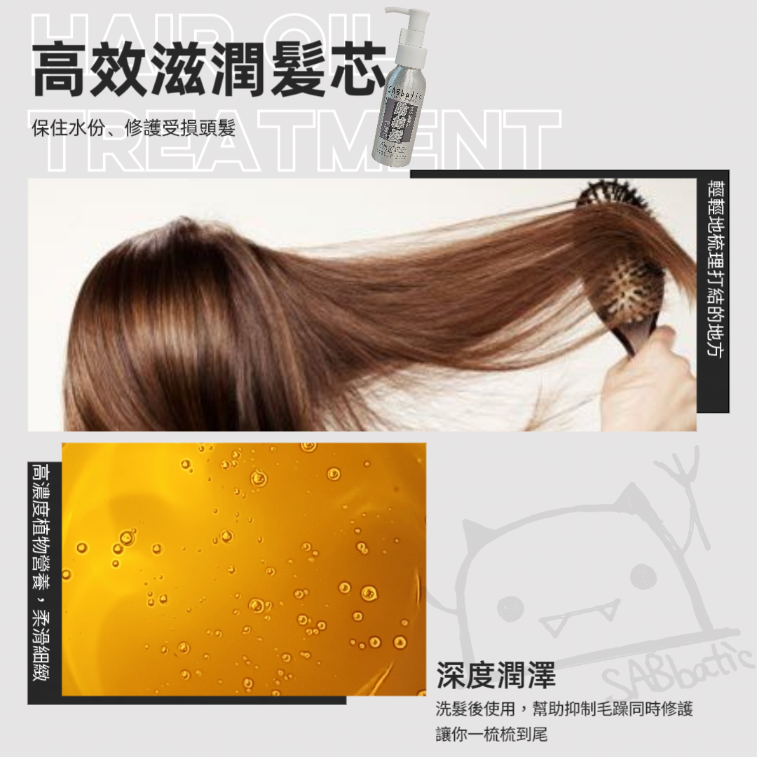 油質屬性的護髮產品,擁有高效滋潤髮芯、保住水份、修護受損頭髮的效果。瞬間救援乾澀、毛躁的髮絲!嚴選15種天然植物油的配方,極適合生活壓力大、或造型頻繁而掉髮脫髮的都巿人使用。