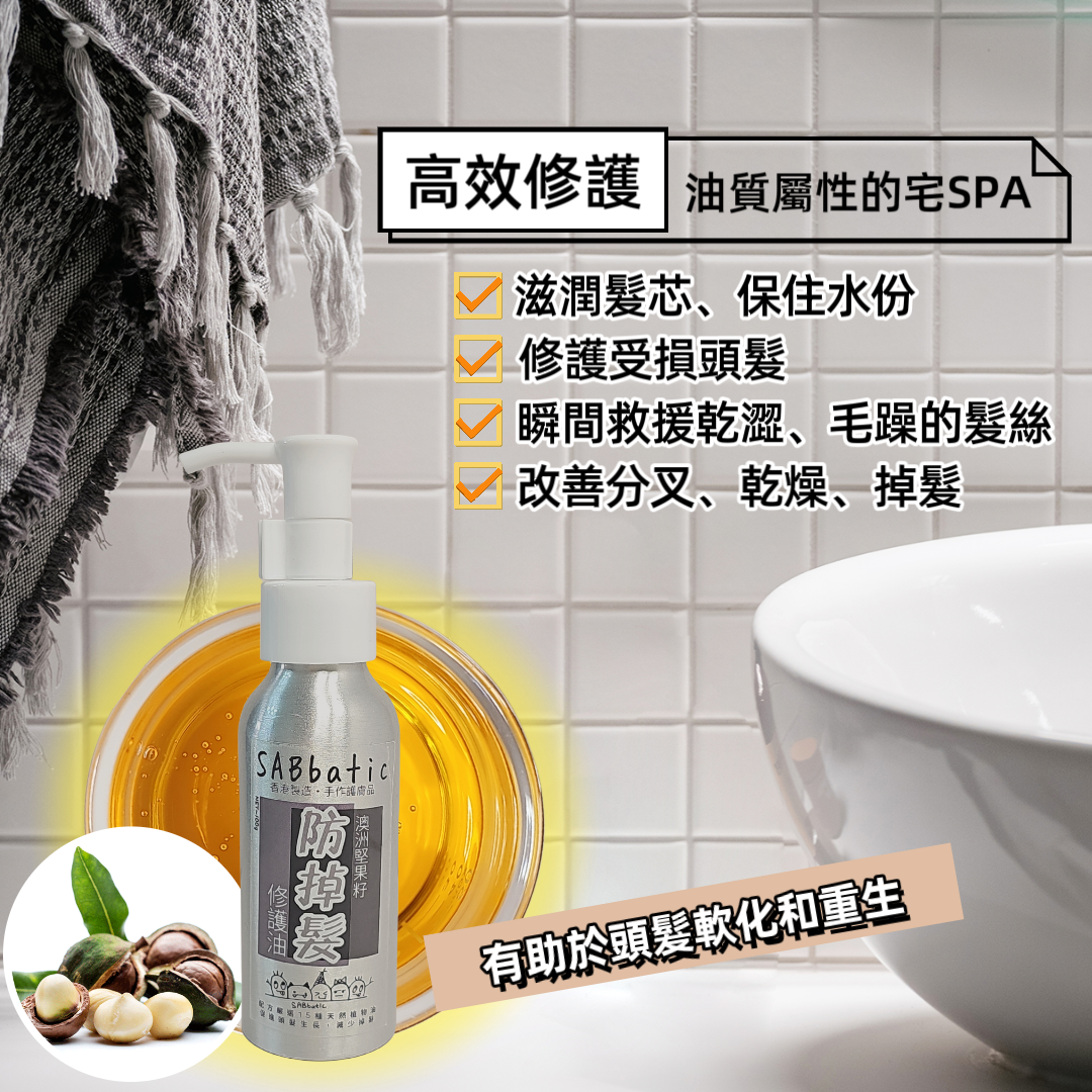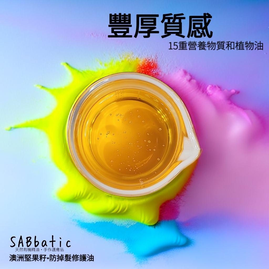 1.澳洲堅果籽油:含有豐富的營養物質和油,其中含有鈣、複合維他命B、維他命E、蛋白質、磷和鐵,並含有80%單一飽和脂肪。它也含有非常高含量的棕櫚油酸(ω-7脂肪酸)。這種油不油膩且清爽,輕易的就可以被頭髮所吸收。這對我們來說是一大好處,因為它可以快速被吸收到你的頭髮內,而不會在你頭髮上產生堆積或殘留物。有助於頭髮軟化和重生、加強和促進頭髮健康、消除毛躁、修復損壞頭髮、抗UV。