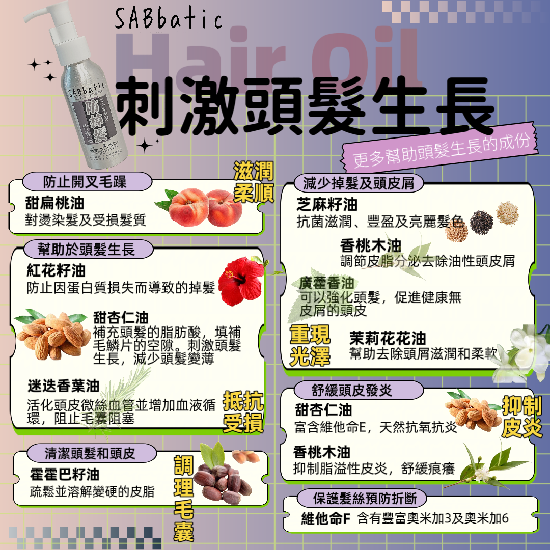 5.芝麻籽油:可以減少掉髮及頭皮屑,同時亦有抗菌、滋潤、豐盈及亮麗頭髮色澤的功效。