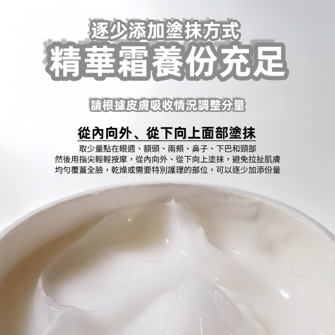 精華霜養份充足,建議先取青豆大小的分量塗上面。均勻塗抹完成後,再根據皮膚吸收情況再調整分量。一般吸收速度,護膚品均勻塗抹後在30秒內便會完成,即肌膚表面的油水光澤消去,只留下滋潤感。