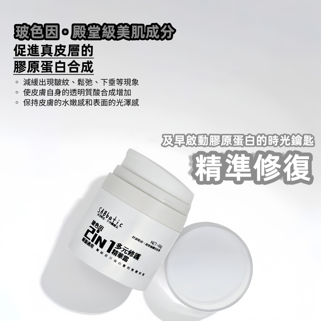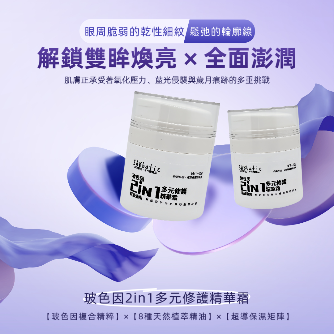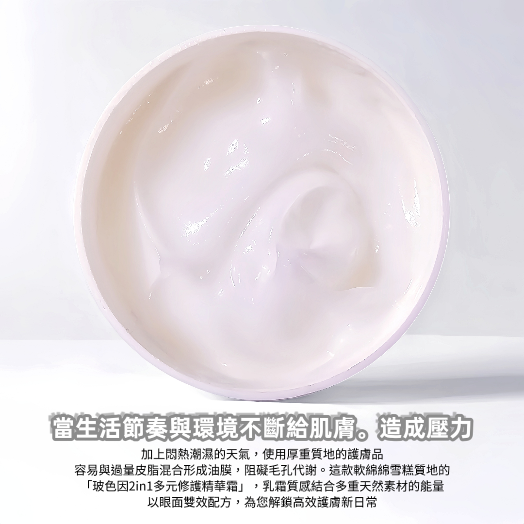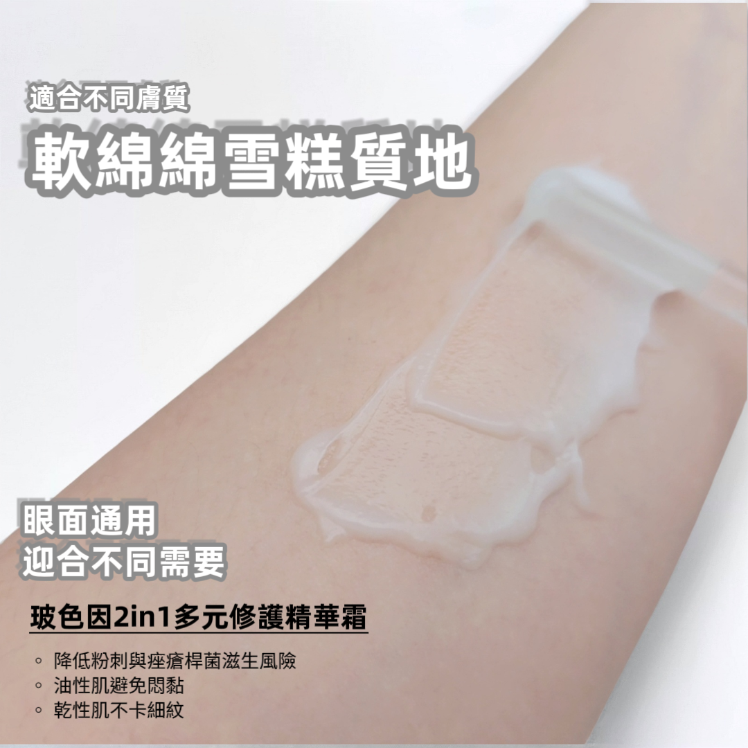 當生活節奏與環境不斷給肌膚造成壓力, 加上悶熱潮濕的天氣,使用厚重質地的護膚品容易與過量皮脂混合形成油膜,阻礙毛孔代謝。這款軟綿綿雪糕質地的「玻色因2in1多元修護精華霜」,乳霜質感結合多重天然素材的能量,以眼面雙效配方,為您解鎖高效護膚新日常。油性肌避免悶黏,降低粉刺與痤瘡桿菌滋生風險、乾性肌不卡細紋。實現秒速吸收,並高效極簡的保養 ,四大主要功效:(1)深層滲透補水、(2)重建肌膚天然防護盾、(3)代謝過多的角質、(4)同步改善眼周暗沉與提升肌膚緊緻度,維持健康年輕肌。