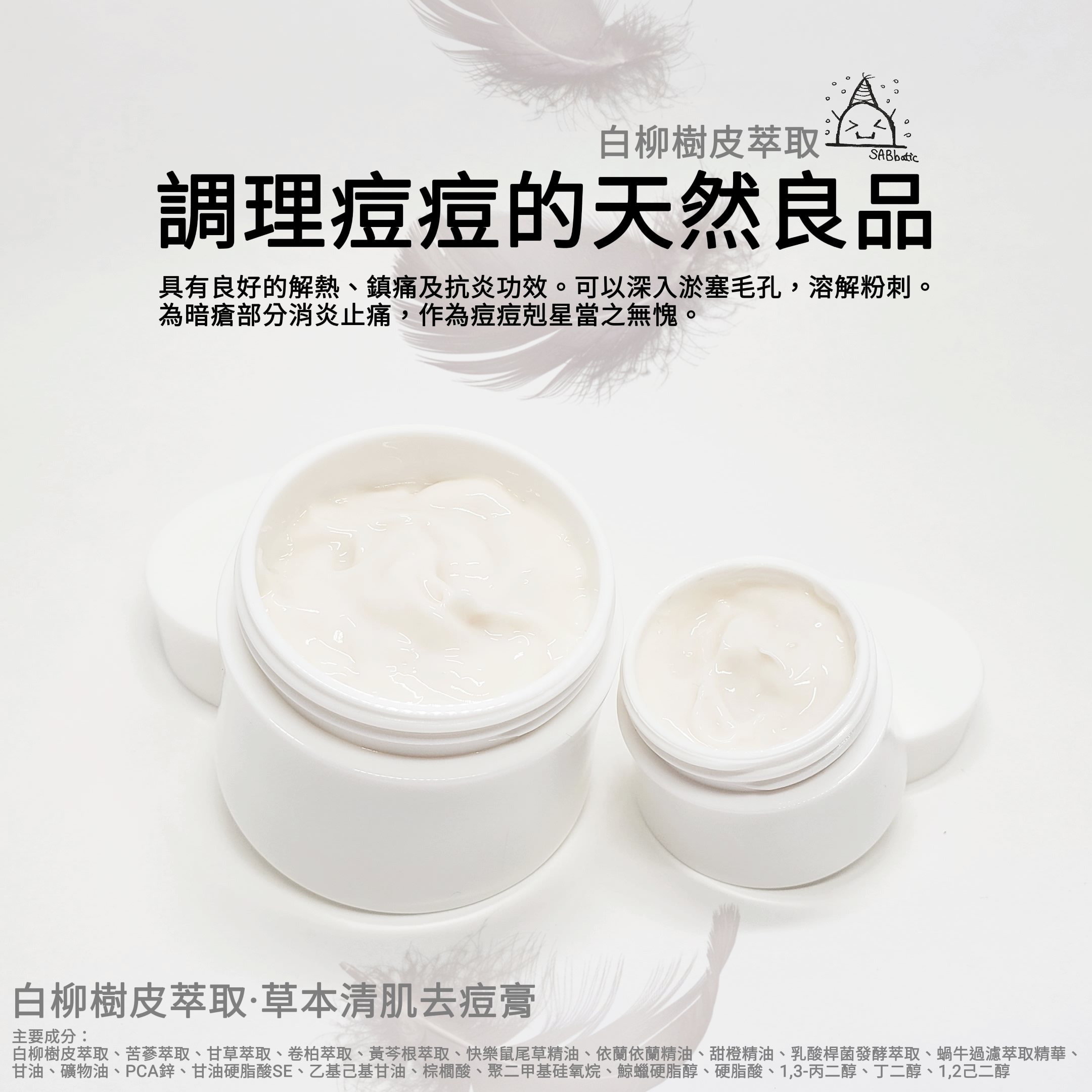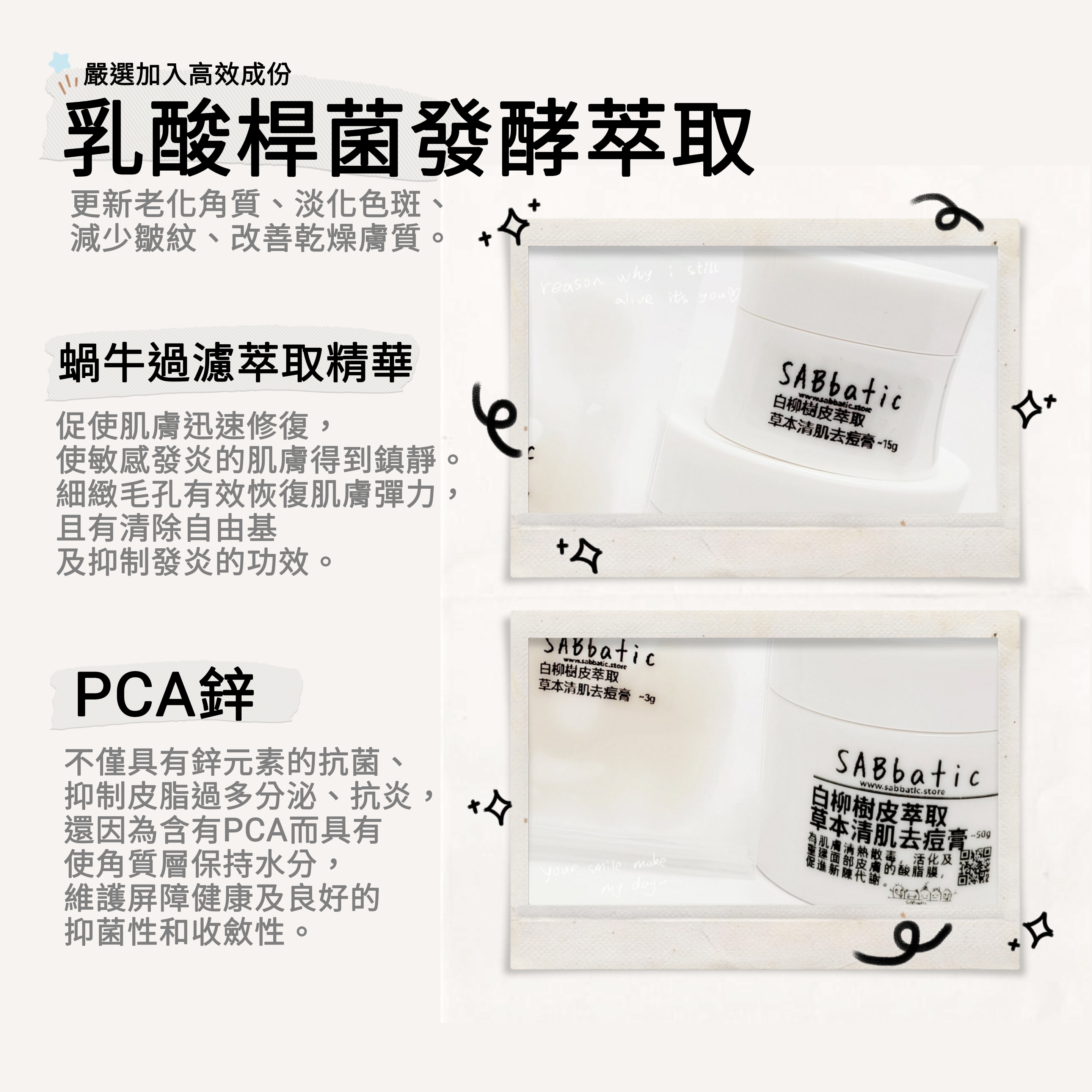 1.白柳樹皮萃取:白柳樹是至今許多配方師愛用的天然草本,常被磨成粉使用, 被廣泛應用在美妝護理產品之中,其功用有消炎、舒緩、止痛,還是很好的抗菌劑, 白柳樹皮中天然的水楊酸,保留了調理角質及抗菌等特質, 同時降低對皮膚的刺激程度,是調理痘痘的天然良品。柳樹皮作為一種天然成分具有良好的解熱、鎮痛及抗炎功效,所有很多針對暗瘡的天然抗痘產品皆能找到它的身影,可以深入淤塞毛孔,溶解粉刺,為暗瘡部分消炎止痛,作為痘痘剋星當之無愧。
