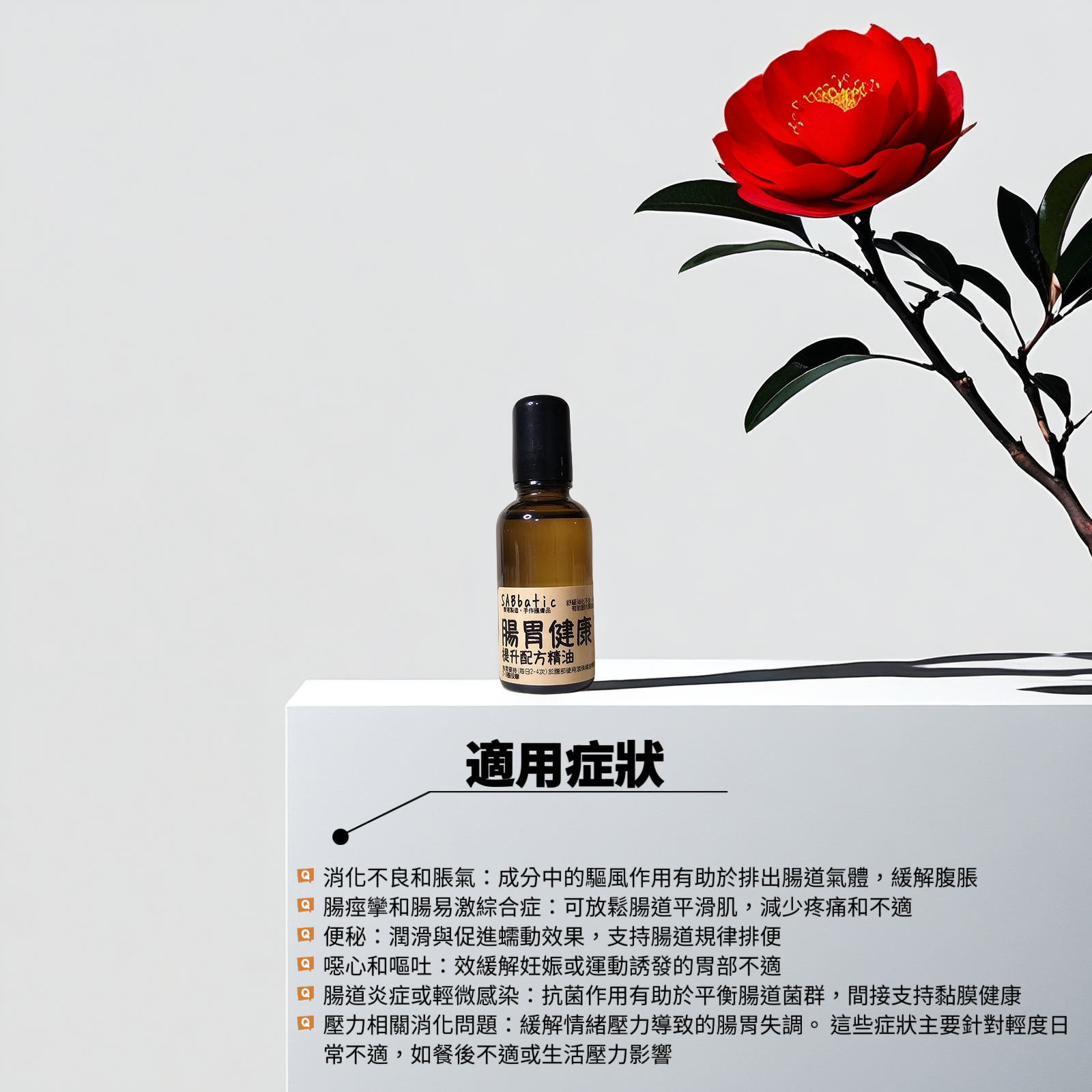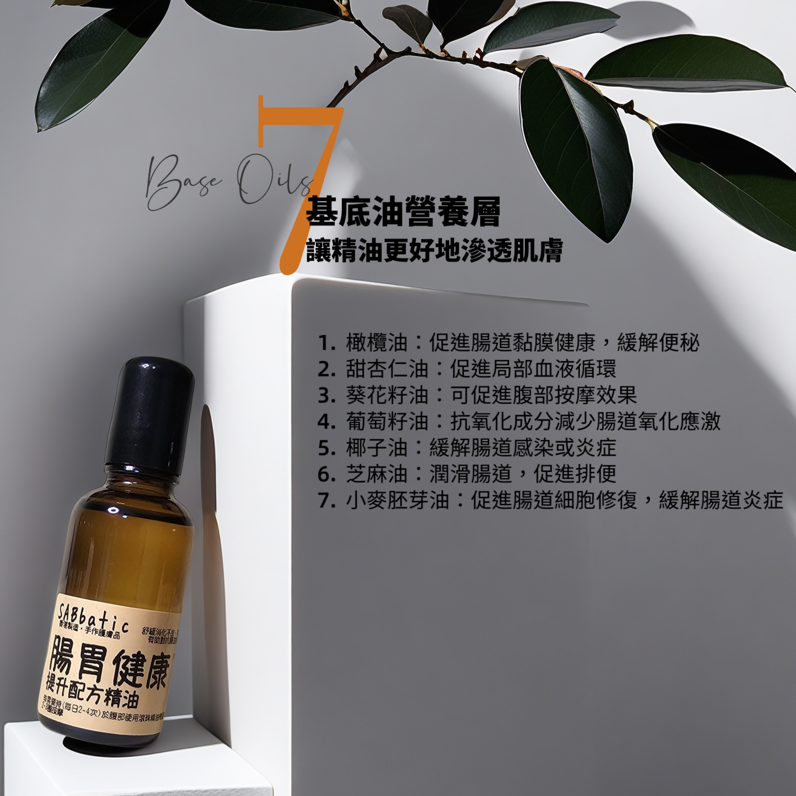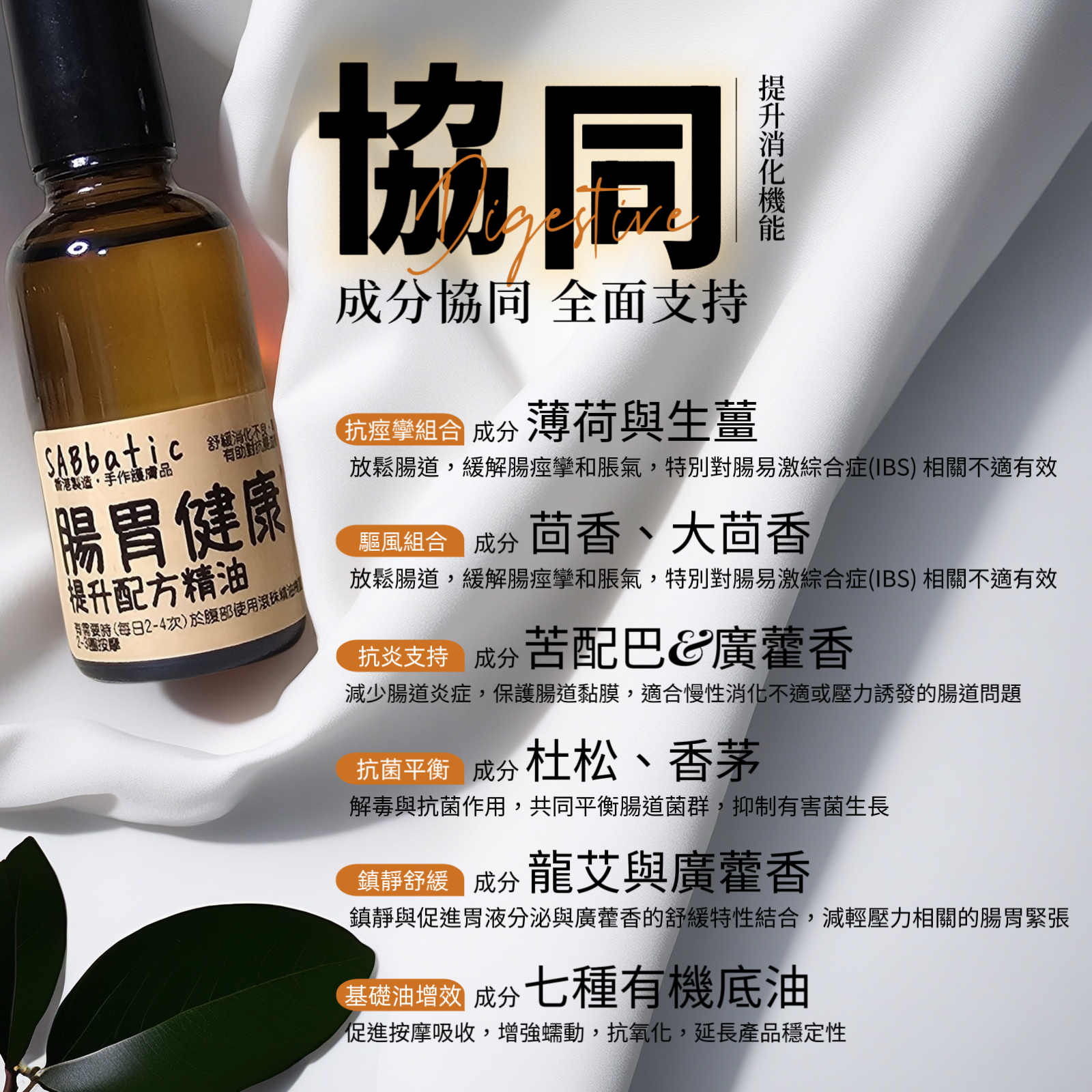 協同作用:透過精油與基礎油的協同作用,全面支持腸胃健康。