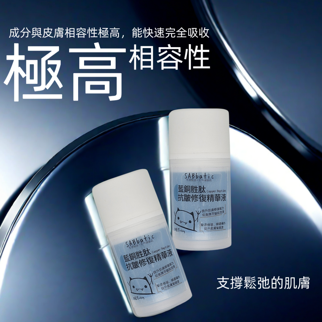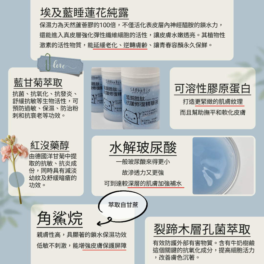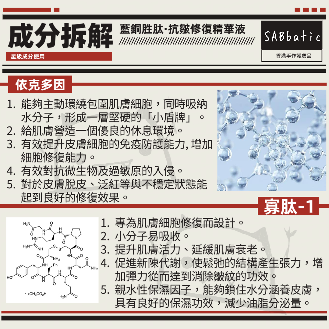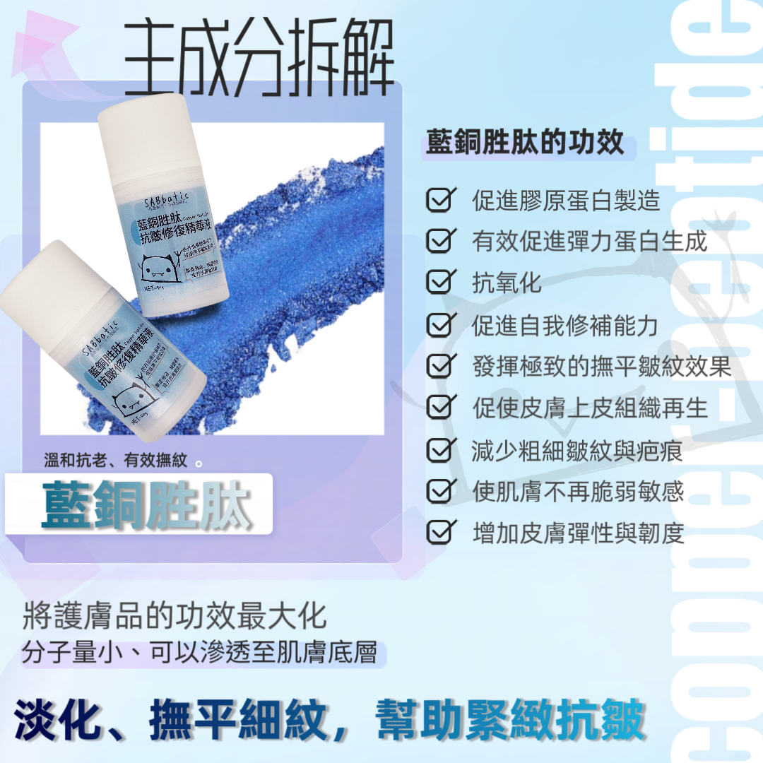 1.藍銅胜肽:即三勝肽-1銅,分子量小,能有效促進膠原蛋白和彈力蛋白製造和抗氧化, 同時更深入肌膚滲透,促進自我修補能力,發揮極致的撫平皺紋效果。它不僅可以促使皮膚上皮組織再生,恢複肌膚年輕、減少粗細皺紋與疤痕、改善肌膚彈性、使角質細胞和纖維姆細胞增生,更可以讓皮下組織增厚,使肌膚不再脆弱敏感,增加皮膚彈性與韌度,也可以將護膚品的功效最大化。