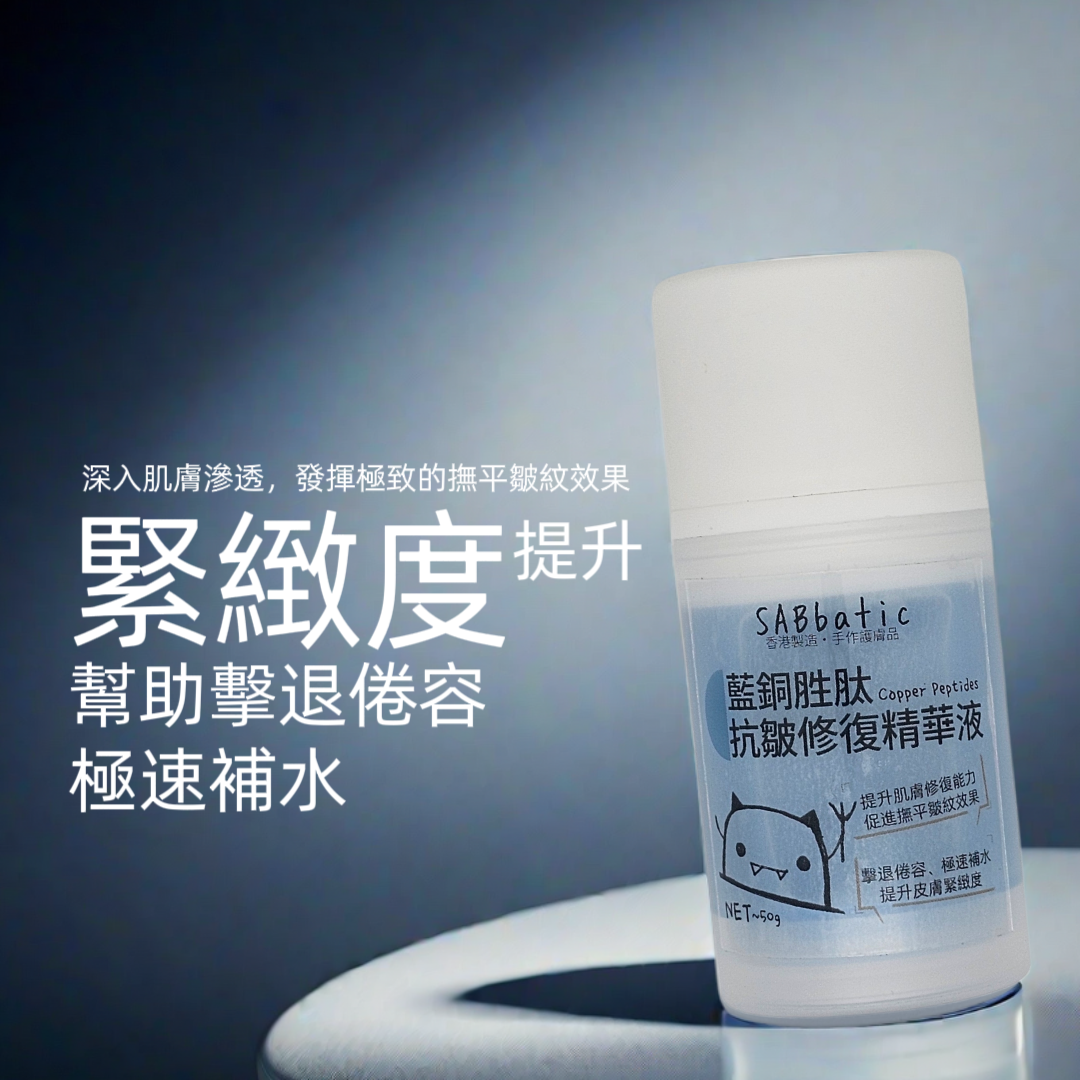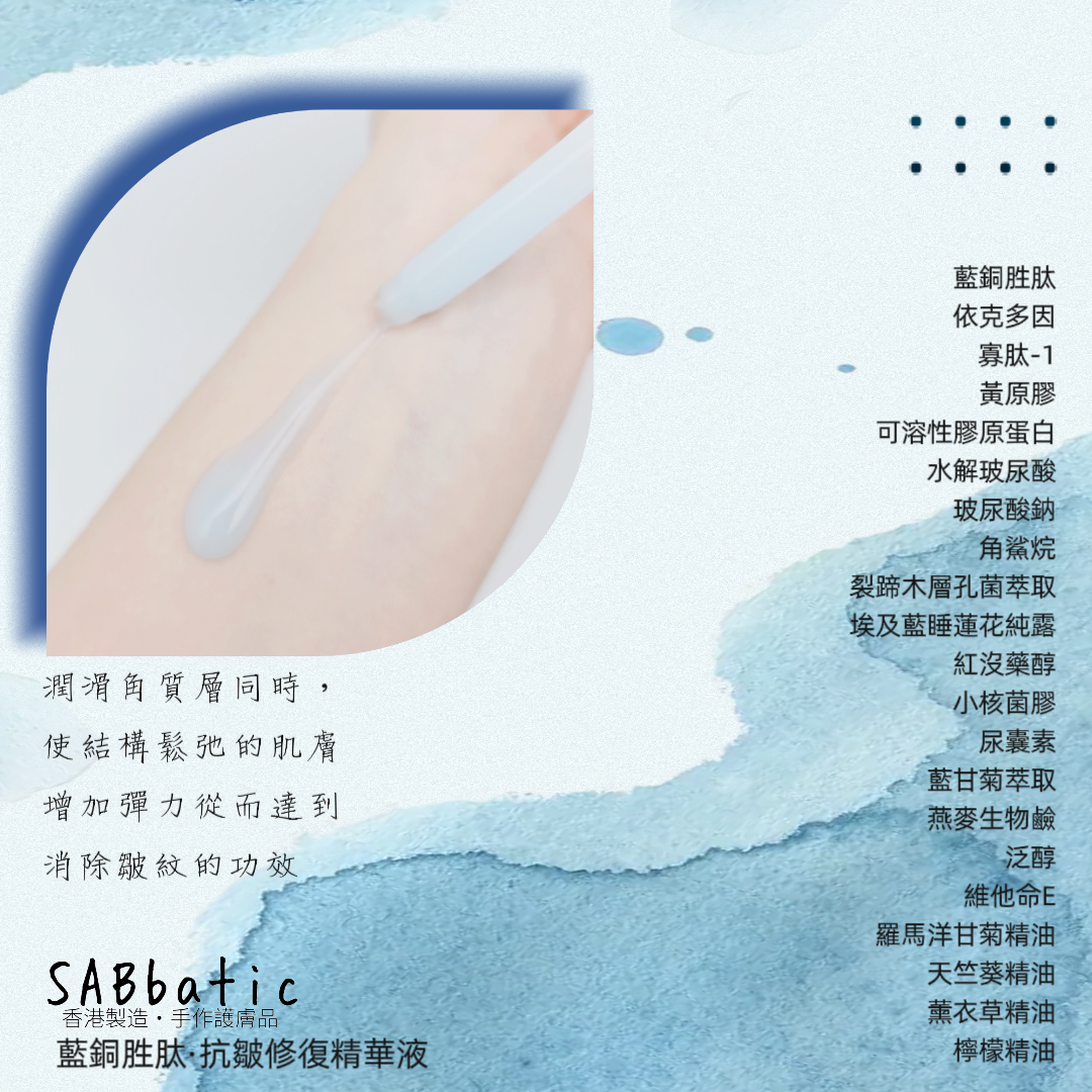 幫助擊退倦容、提升皮膚緊緻度、極速補水。配方使用超强抗皺成分藍銅胜肽,再結合15種嚴選緊肌素材,促進膠原蛋白和彈力蛋白的製造。深入肌膚滲透,促進抗氧化和自我修補能力,發揮極致的撫平皺紋效果。