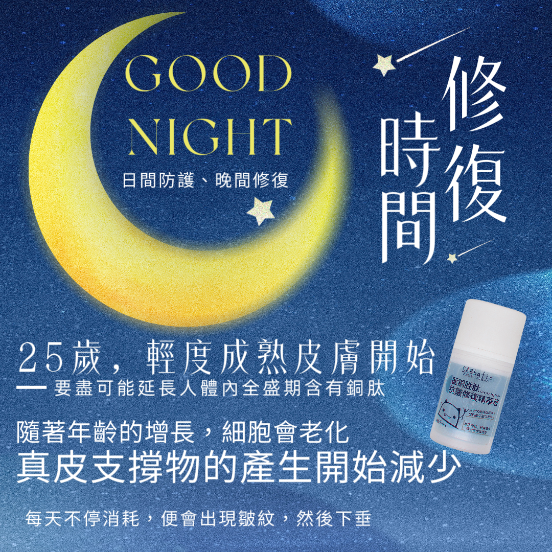 25歲,輕度成熟皮膚開始,要盡可能延長人體內全盛期含有銅肽,不需等到老了才用抗老化護膚品。隨著年齡的增長,細胞會老化,因此真皮支撐物的產生開始減少,而每天不停消耗,便會出現皺紋,然後下垂。這就是皮膚老化的開始。