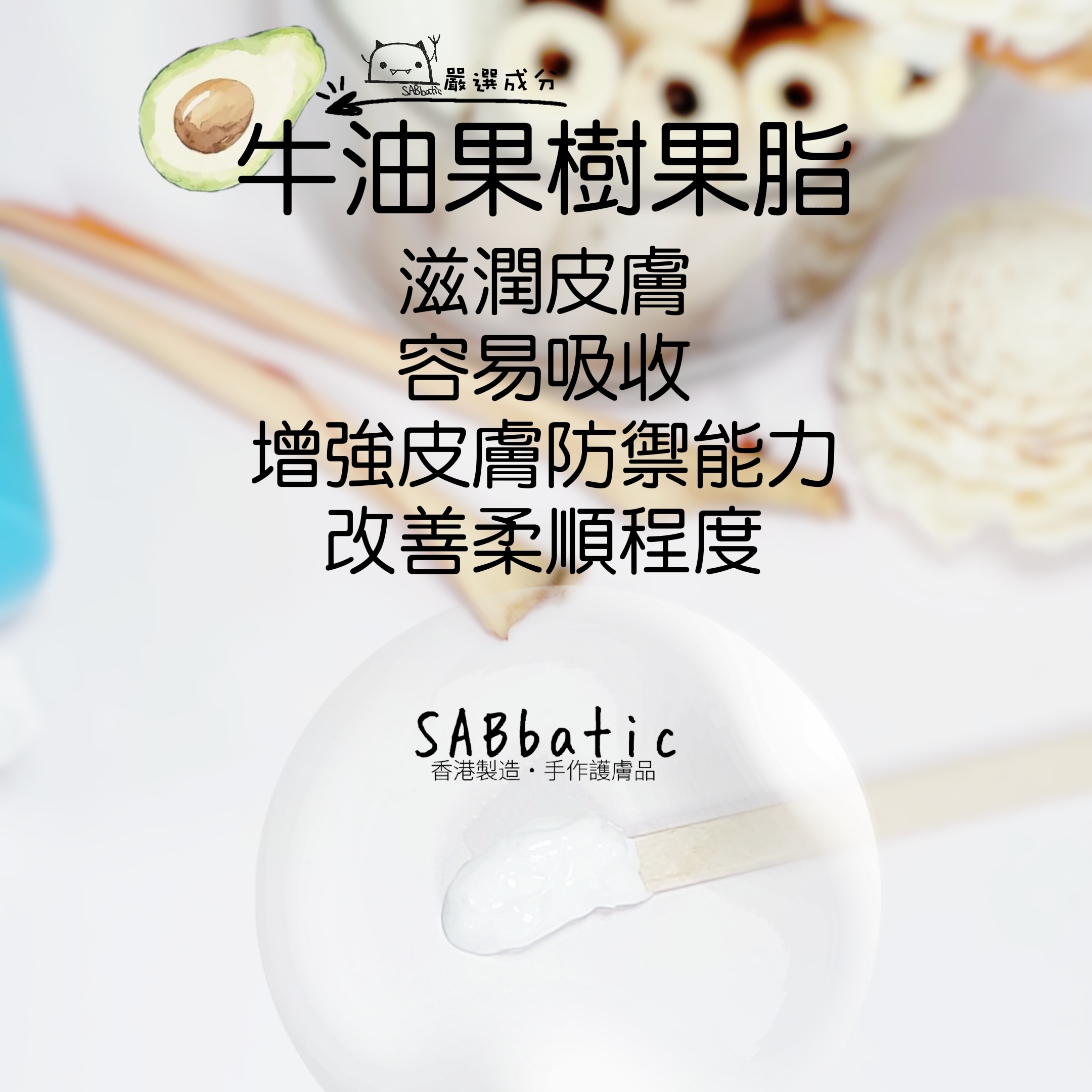 牛油果樹果脂:滋潤皮膚而且容易吸收、 富含不飽和脂肪酸、 有效增強皮膚保濕能力。 含豐富維他命E、維他命A,以及尿囊素。 增強皮膚防禦能力以及柔順程度。