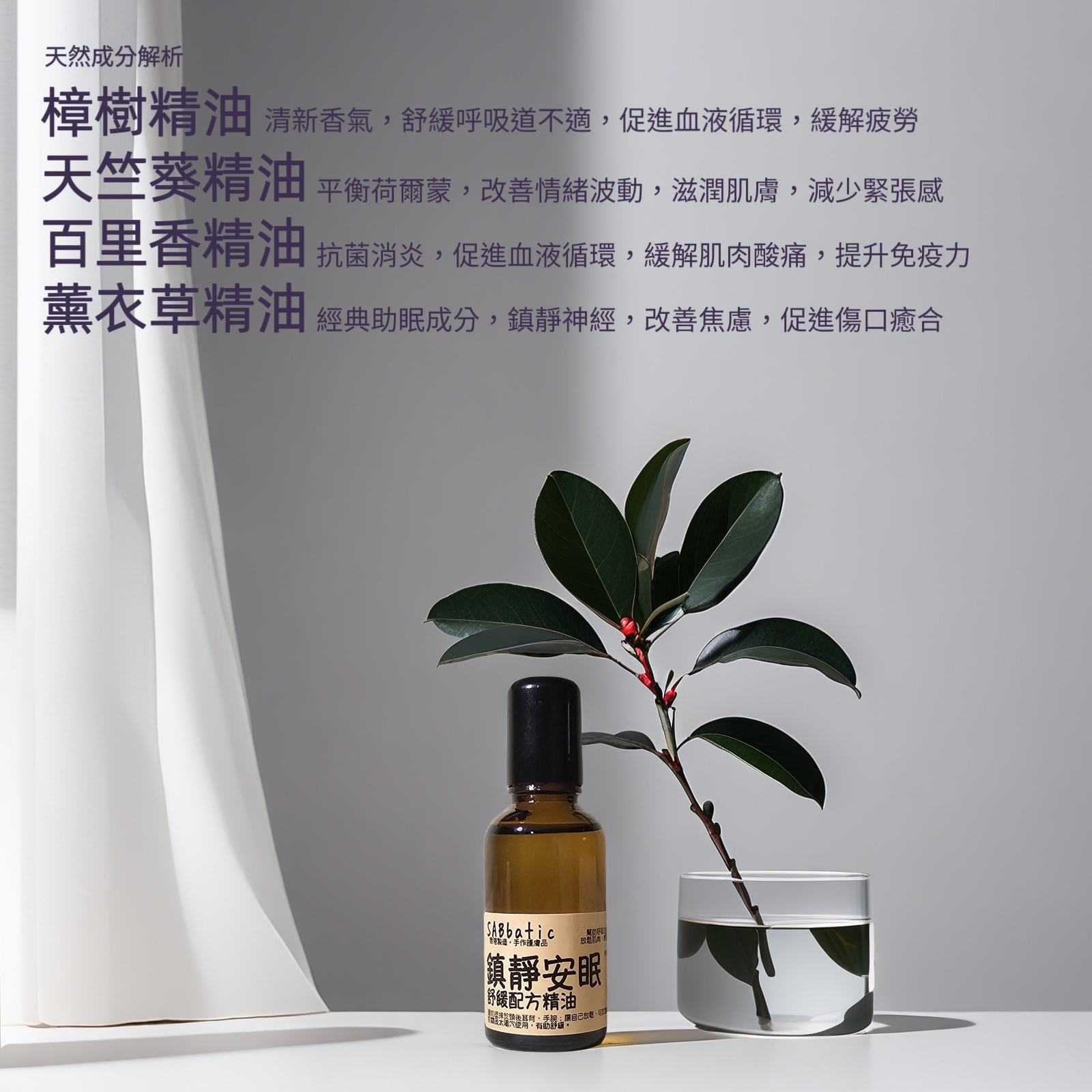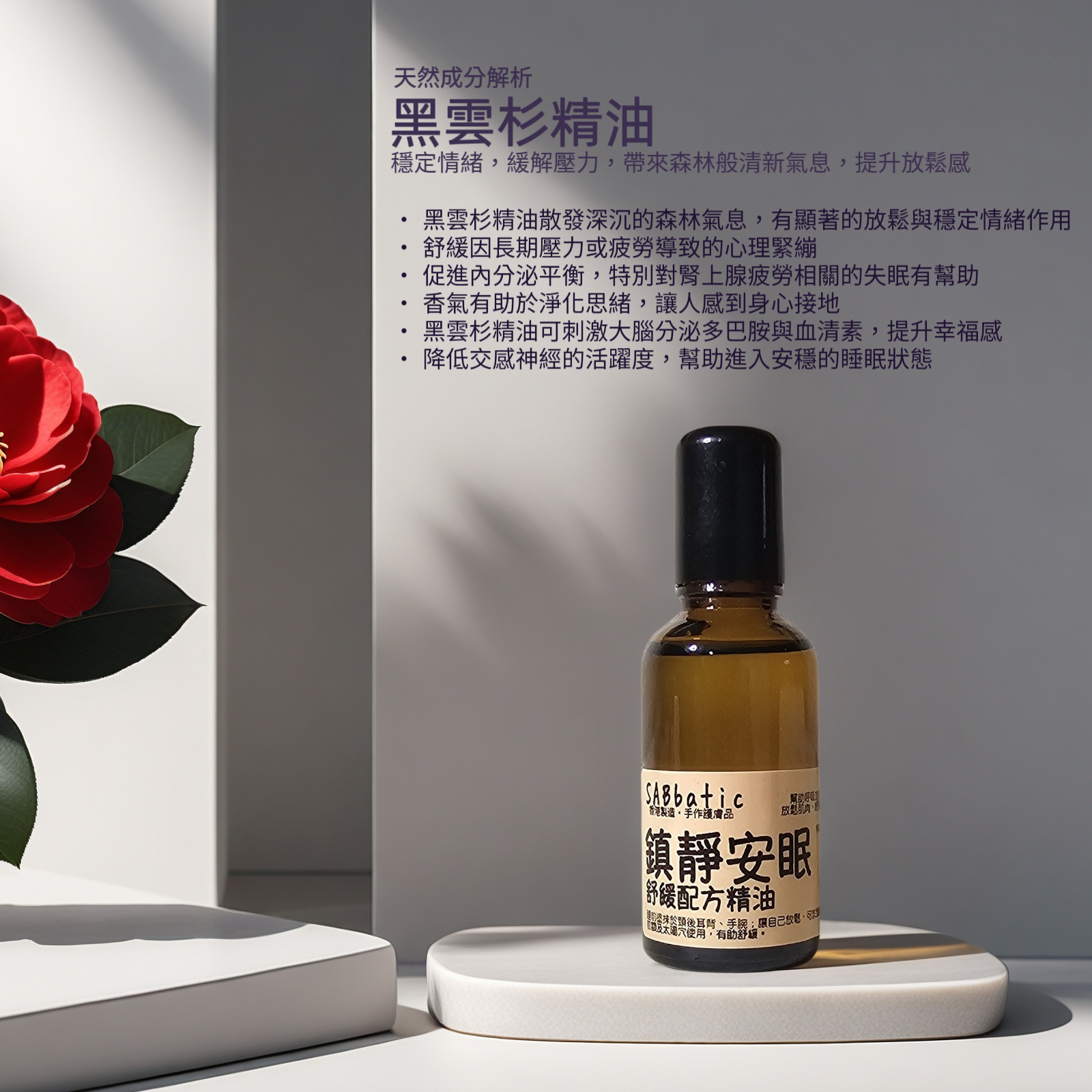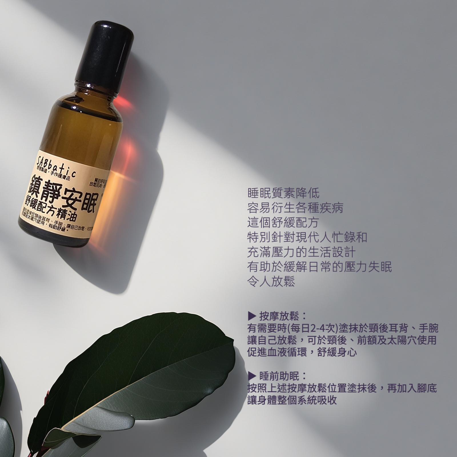 在快節奏的現代生活中,壓力、焦慮與失眠成為許多人的日常挑戰。為了讓您找回內心的平靜與優質的睡眠,SABbatic精心調配了「鎮靜安眠·舒緩配方精油」。這款精油融合多種天然植物精油與基底油,以完美配比與自然力量,幫助您舒緩身心,重拾安穩好眠。