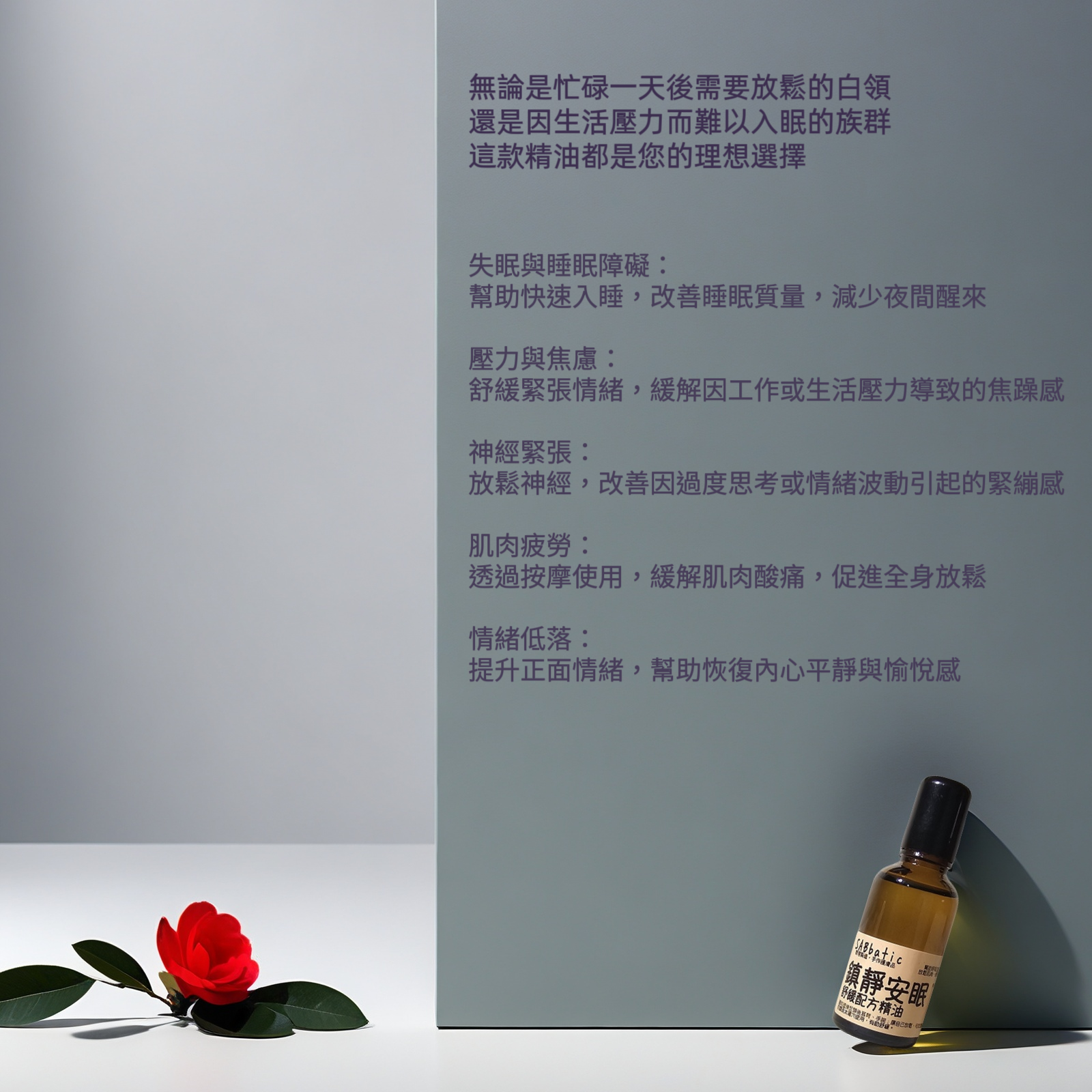 適用症狀:無論是忙碌一天後需要放鬆的白領,還是因生活壓力而難以入眠的族群,這款精油都是您的理想選擇。
