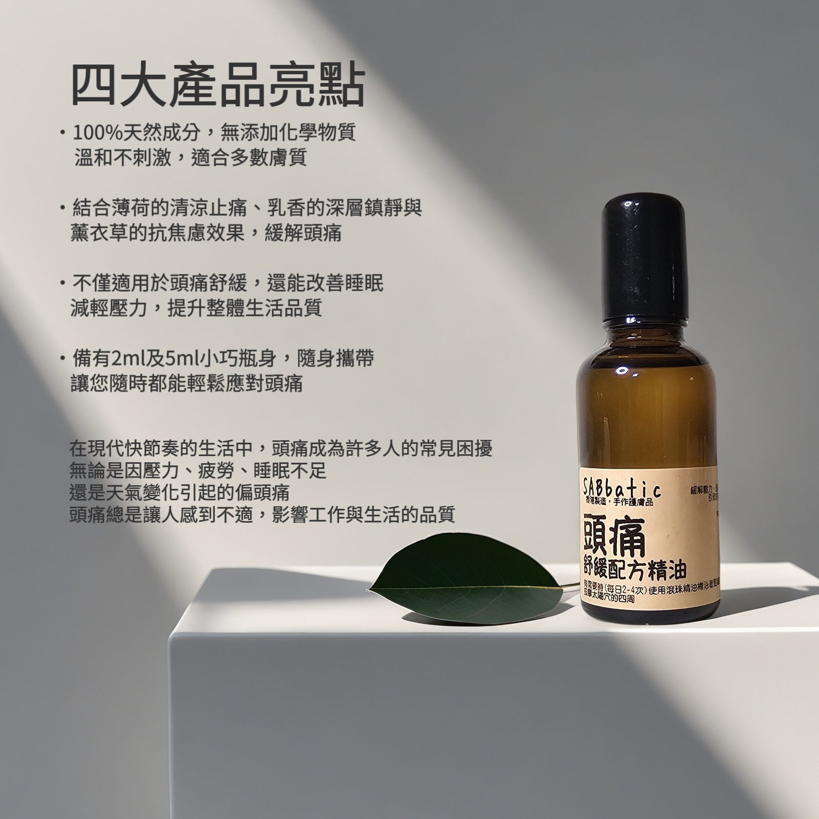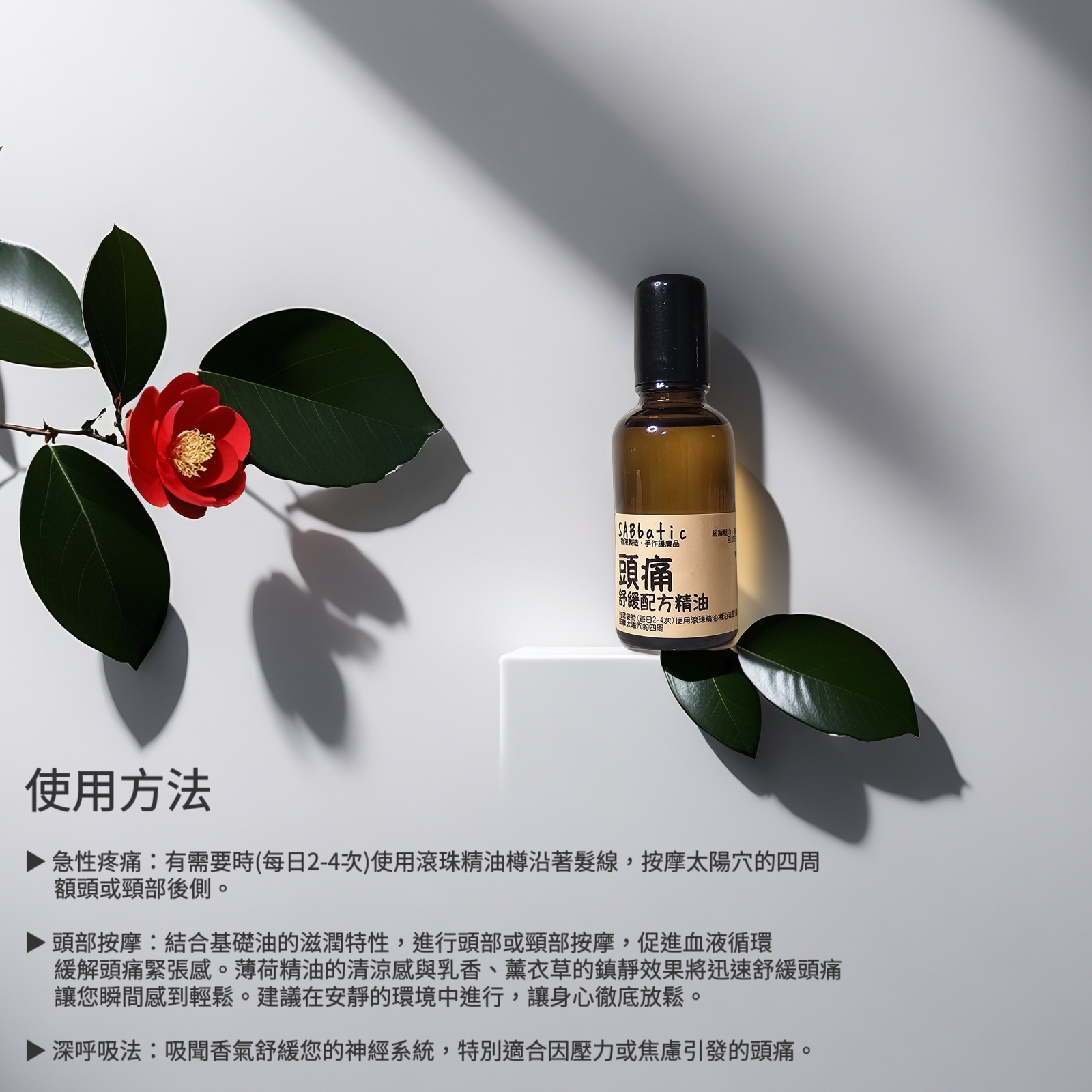 「頭痛・舒緩配方精油」,一款專為舒緩頭痛設計的天然精油產品,結合多種珍貴精油與基礎油,以貼心配方與自然力量,為您帶來快速、溫和的頭痛緩解體驗。讓我們一起探索這款產品的獨特成分與卓越功效,重新找回輕鬆無負擔的每一天!