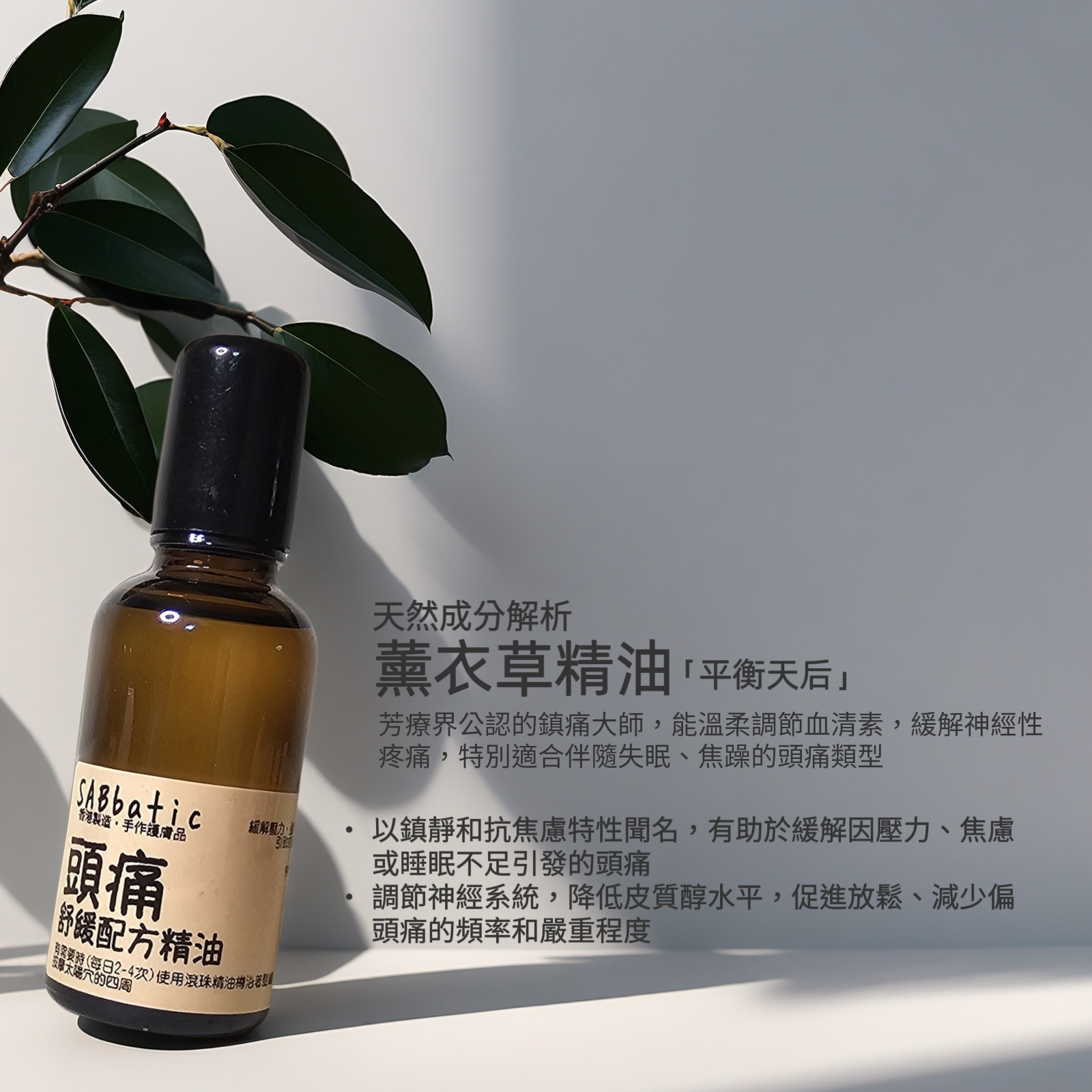1️⃣ 薰衣草精油:「平衡天后」薰衣草精油,芳療界公認的鎮痛大師,能溫柔調節血清素,緩解神經性疼痛,特別適合伴隨失眠、焦躁的頭痛類型。