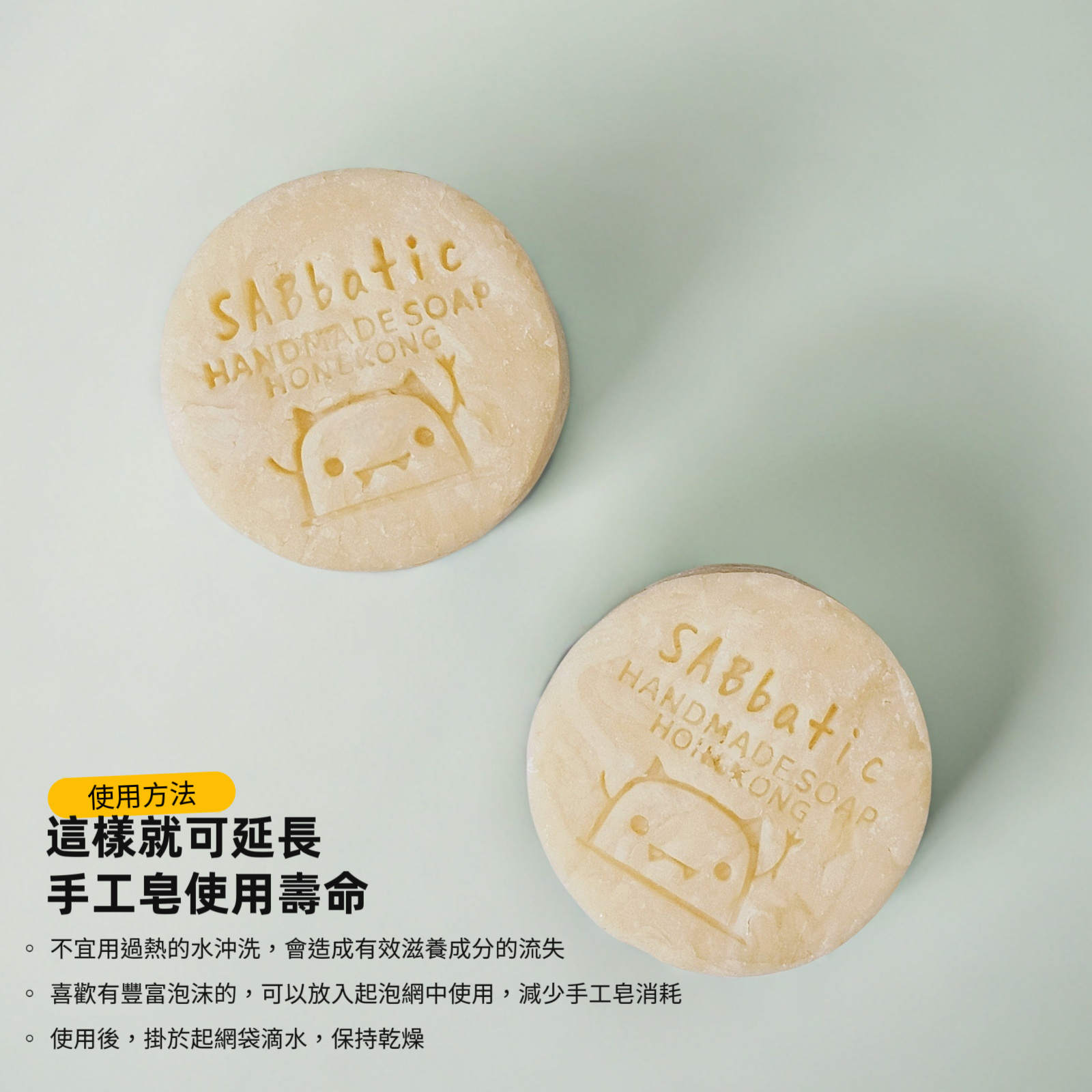 由於手工皂中富含護膚成分,不宜用過熱的水沖洗,會造成有效滋養成分的流失。喜歡有豐富泡沫的人可以將手工皂裝入起泡網中使用,減少手工皂消耗。使用後,掛於起網袋滴水,保持乾燥,這樣就可延長手工皂使用壽命。
