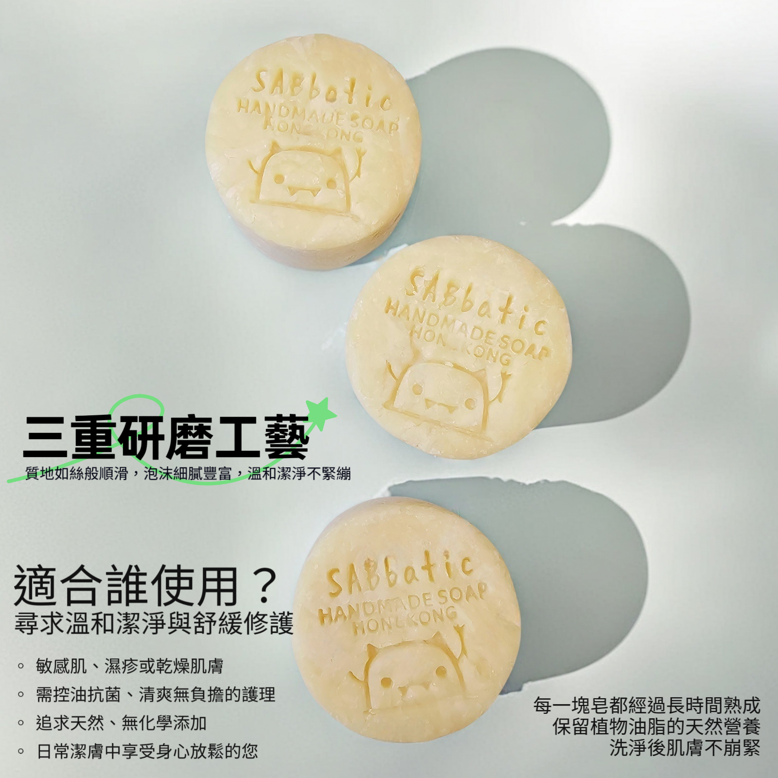 從保養的角度來看,手工皂熟成後,其呈現出越來越滋潤的特質。一塊好的手工皂熟成後,會呈現出最佳的滋潤度,適合各種不同年齡層和膚質的人使用。正如皂匠一直強調,手工皂放得越久,就會越好洗、越溫和。在手工皂的熟成過程中,其溫和度和皂化程度會持續提升,這也正是手工皂成為越來越多人清潔首選的原因。所以說,能得到一塊手工細活打造的研磨皂,是對你的皮膚是最大的呵護與讚美。