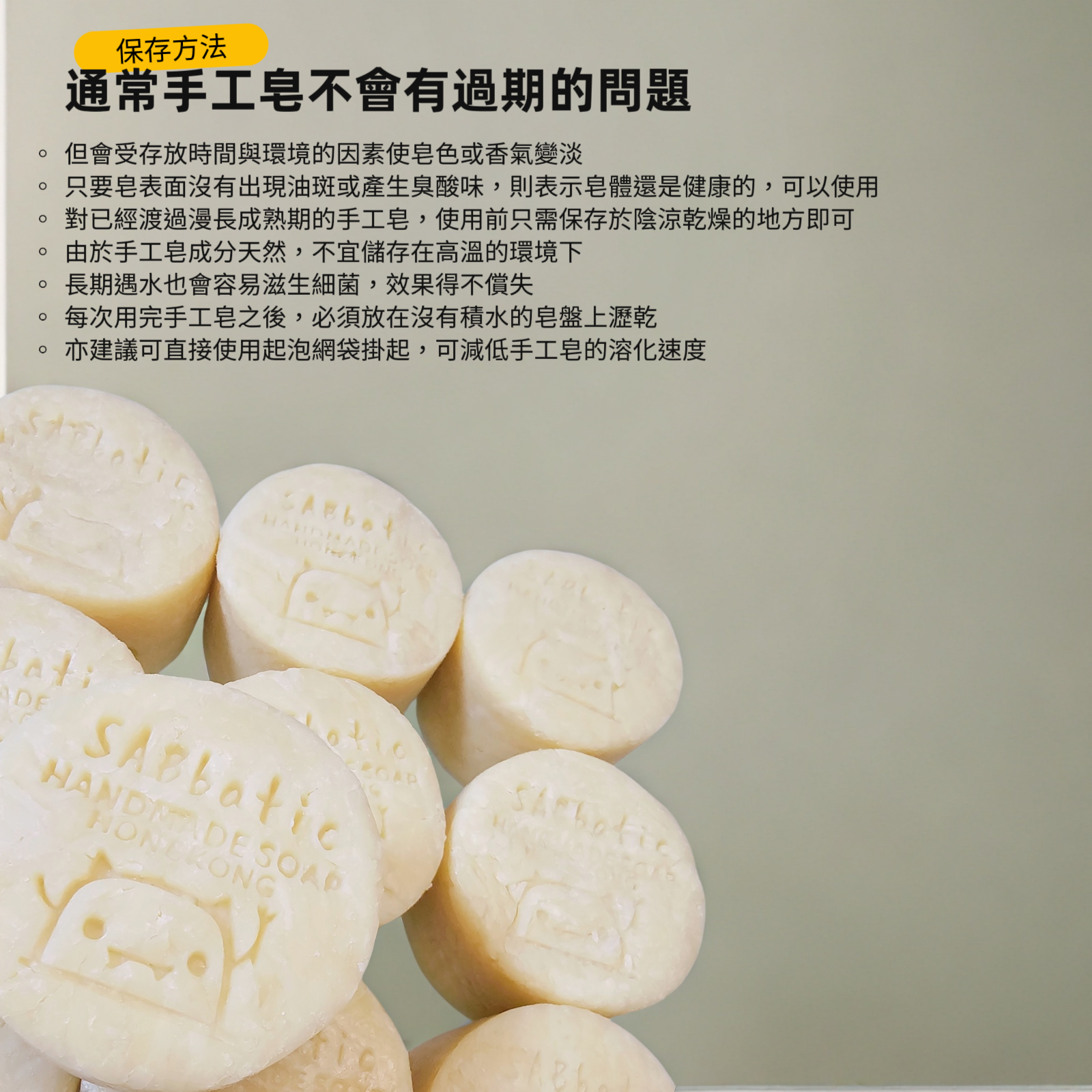 通常手工皂不會有過期的問題,但會受存放時間與環境的因素使皂色或香氣變淡。只要皂表面沒有出現油斑或產生臭酸味,則表示皂體還是健康的,可以使用。對已經渡過漫長成熟期的手工皂,使用前只需保存於陰涼乾燥的地方即可。 由於手工皂成分天然,不宜儲存在高溫的環境下,而長期遇水也會容易滋生細菌,效果得不償失。每次用完手工皂之後,必須放在沒有積水的皂盤上瀝乾,亦建議可直接使用起泡網袋掛起,可減低手工皂的溶化速度。